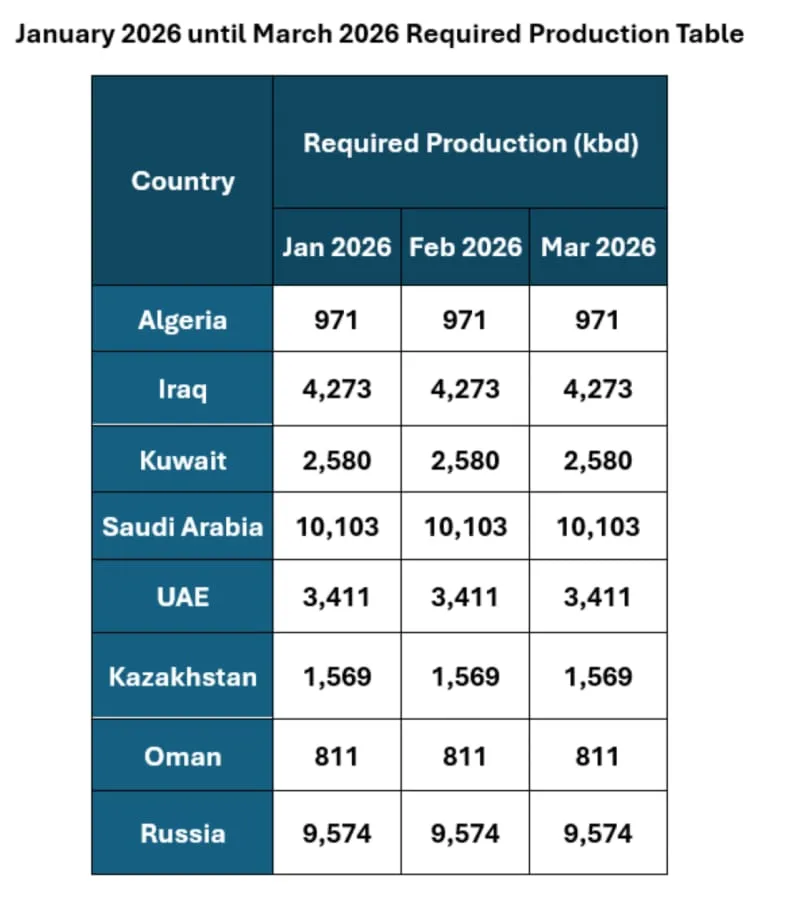 وجددت الدول الثمانية التزامها بالقرار الصادر في 2 نوفمبر 2025، القاضي بتعليق الزيادات الإنتاجية خلال أشهر يناير وفبراير ومارس 2026، مراعاة للعوامل الموسمية، وذلك وفق التفاصيل الواردة في الجدول المعتمد.وحسب بيانات اوبك بلغت حصة انتاج العراق من النفط الخام 4.273 ملايين برميل يوميا خلال الربع الأول من عام 2026 للاشهر كانون الثاني وشباط واذار.