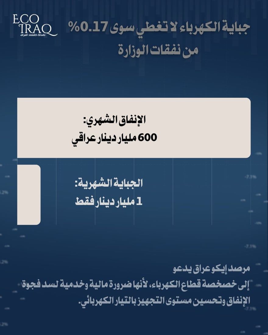 أعلن مرصد إيكو عراق أن الحكومة تنفق نحو 600 مليار دينار شهرياً على قطاع الكهرباء، في وقت لا تتجاوز فيه إيرادات الجباية مليار دينار فقط، أي ما يعادل 0.17% فقط من حجم الإنفاق الكلي، مؤكداً أن هذه النسبة تكشف عن خلل في منظومة الجباية وتمثل نزيفاً مستمراً يسهم في تعميق العجز بالموزانة، داعياً الحكومة إلى خصخصة قطاع الكهرباء أو إشراك القطاع الخاص بشكل فعّال لإنهاء الهدر المالي.