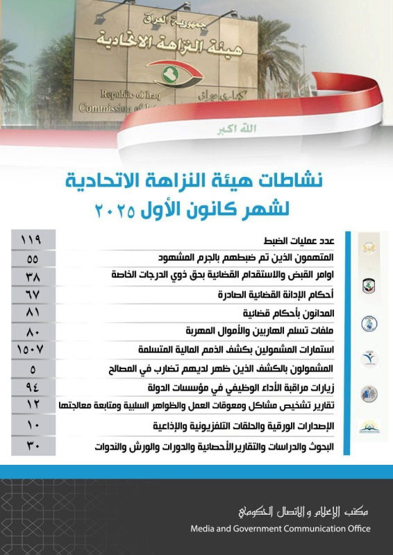 أعلنت هيئة النزاهة الاتحادية اليوم الخميس ( 8 كانون الثاني 2026 )، حصيلة نشاطاتها لشهر كانون الأول 2025، كاشفة عن تنفيذ عشرات عمليات الضبط وإصدار أوامر قبض واحكام قضائية بحق متهمين بالفساد، الى جانب توسيع زياراتها الرقابية ومتابعة ملفات الهاربين والأموال المهرّبة.أدناه الإحصائية كما وردت :