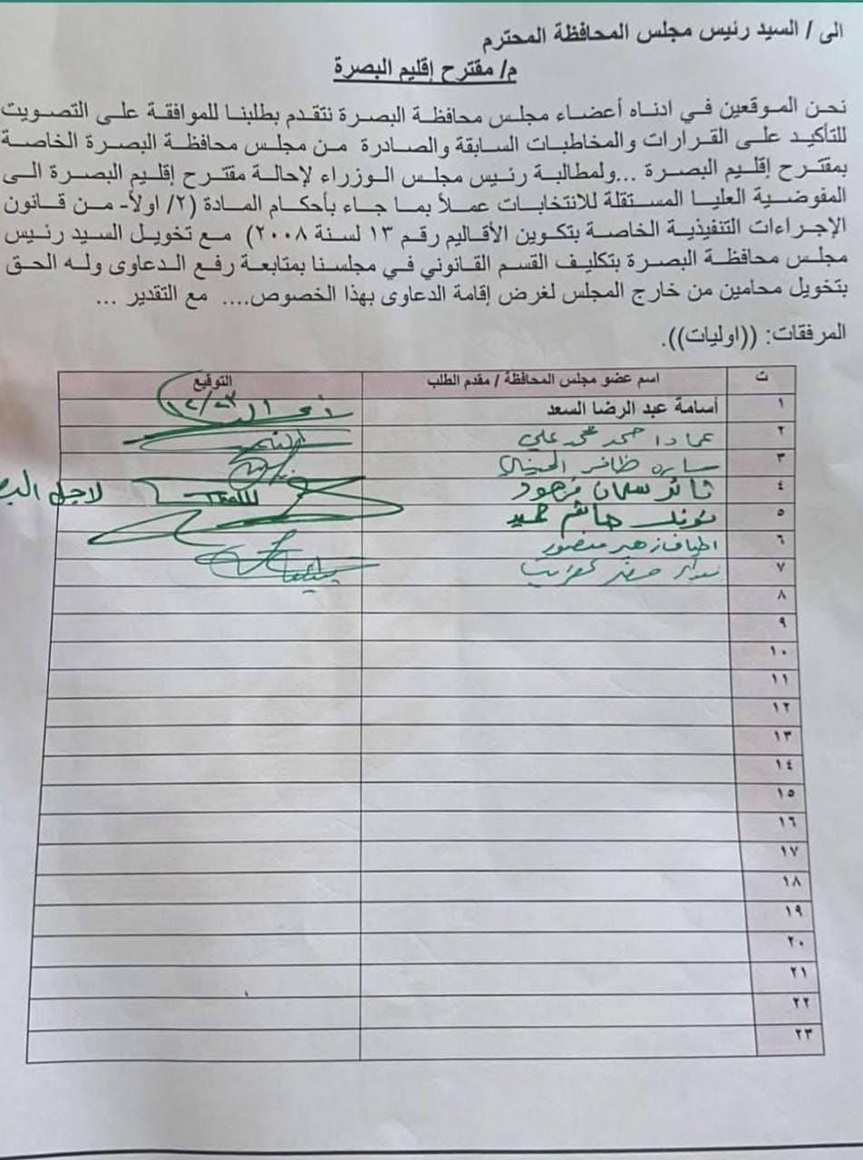 قدم نائب رئيس مجلس محافظة البصرة، أسامة عبد الرضا السعد، طلباً رسمياً لرئيس المجلس خلف البدران، لمخاطبة رئيس مجلس الوزراء بإحالة مقترح “إقليم البصرة” إلى المفوضية العليا المستقلة للانتخابات للمضي في الإجراءات القانونية، مع تخويل رئاسة المجلس باللجوء إلى القضاء والاستعانة بخبراء قانونيين لمتابعة الدعاوى، وبحسب وثيقة اطلعت ، فإن 7 أعضاء في مجلس البصرة، وقعوا على الطلب المذكور.