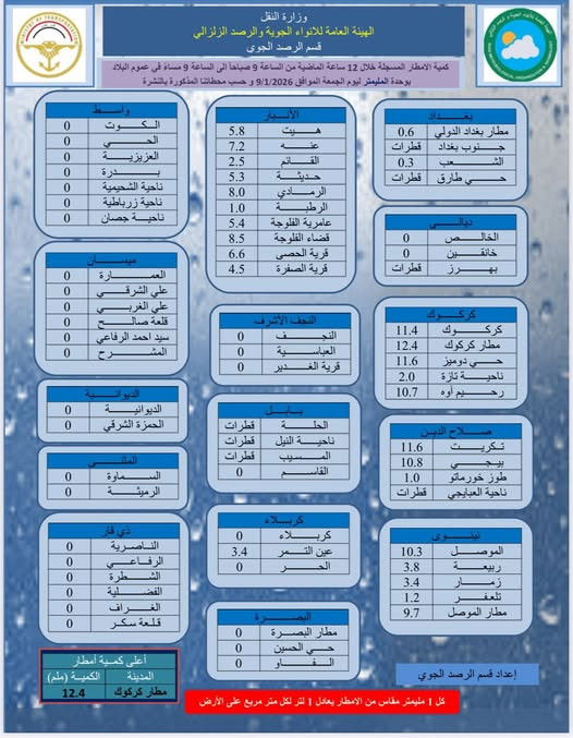 أصدرت الهيئة العامة للأنواء الجوية والرصد الزلزالي، اليوم السبت، تقريرا يوضح كمية الأمطار المسجلة خلال 12 ساعة الماضية من الساعة التاسعة صباحا الى الساعة التاسعة مساءً من يوم الجمعة المصادف 9/1/2026، بحسب بيان الهيئة وتلقته شبكة "الساعة".