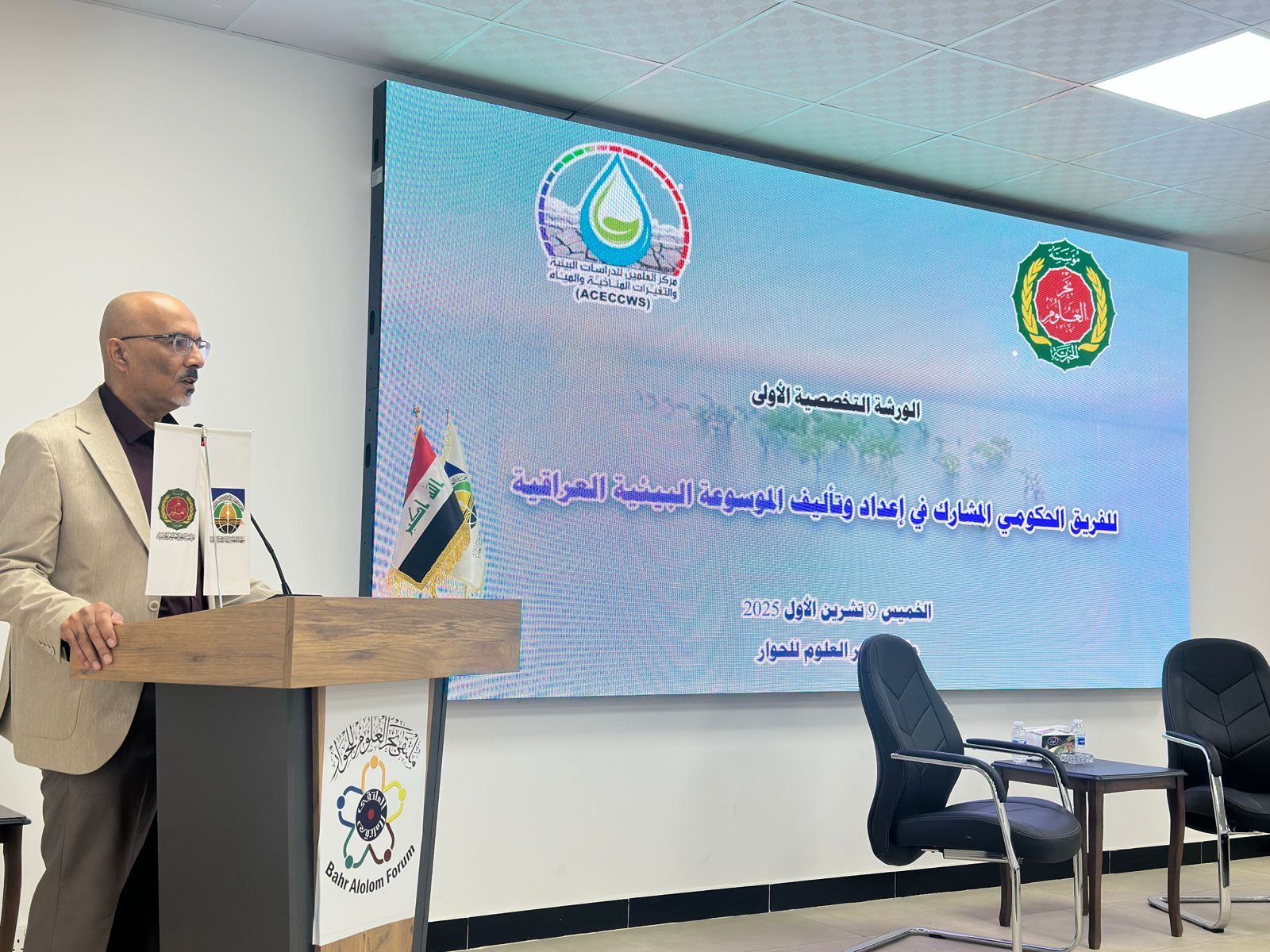 عقد الفريق الحكومي المشارك في إعداد وتأليف الموسوعة البيئية العراقية، ورشته التخصصية الأولى يوم الخميس الموافق ٩ تشرين الأول ٢٠٢٥، في ملتقى بحر العلوم للحوار ببغداد وذلك ضمن باكورة أعمال مركز العَلَمين للدراسات البيئية والتغيرات المناخية والمياه.