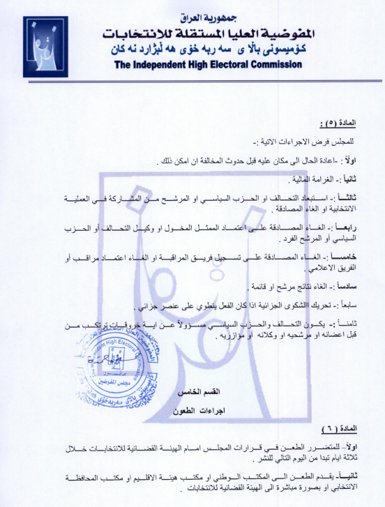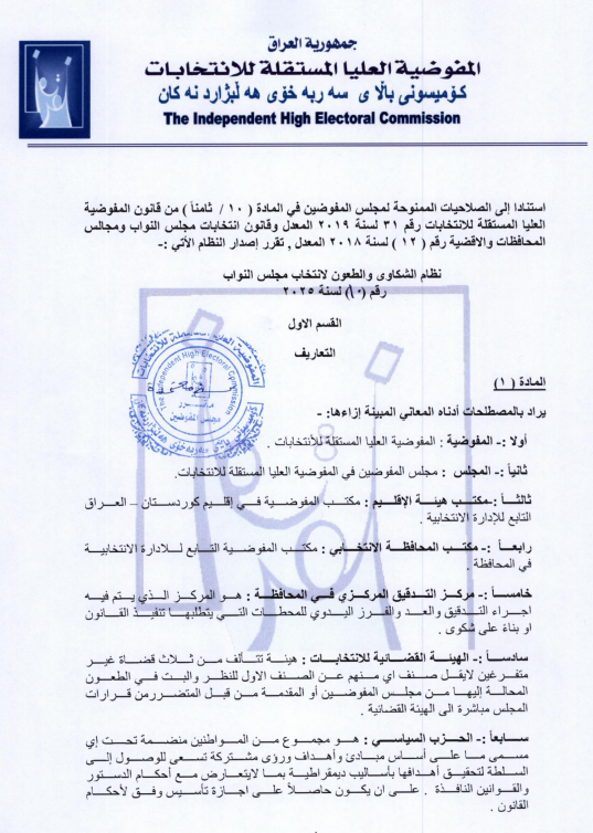 نشرت المفوضية العليا المستقلة للانتخابات، اليوم الخميس (31 تموز 2025)، نظام الشكاوى والطعون لانتخابات مجلس النواب رقم (10) لسنة 2025، على موقعها الإلكتروني الرسمي.