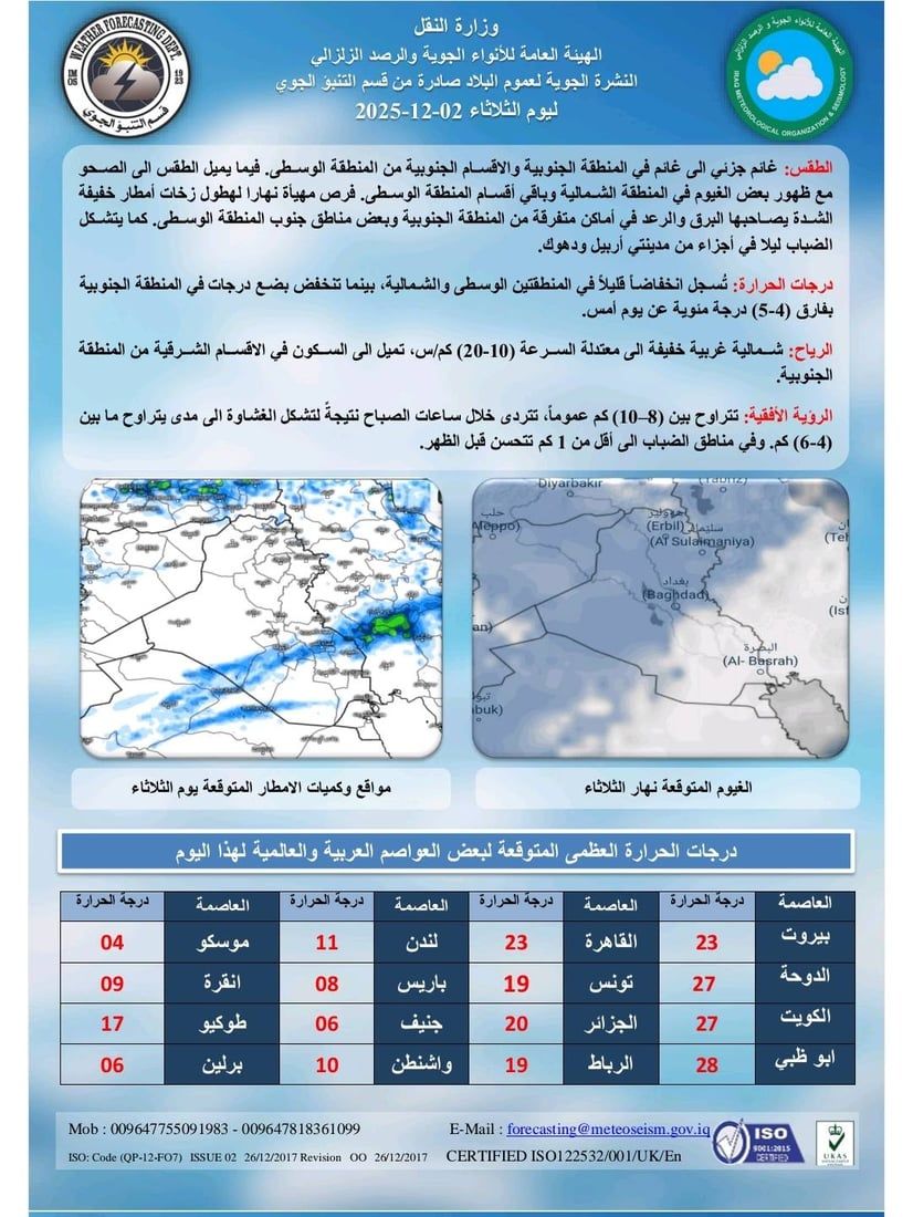 الطقس: غائم جزئي إلى غائم في المنطقة الجنوبية والأقسام الجنوبية من المنطقة الوسطى، فيما يميل الطقس إلى الصحو مع ظهور بعض الغيوم في المنطقة الشمالية وباقي أقسام المنطقة الوسطى، فرص مهيأة نهاراً لهطول زخات أمطار خفيفة الشدة يصاحبها البرق والرعد في أماكن متفرقة من المنطقة الجنوبية وبعض مناطق جنوب المنطقة الوسطى، كما يتشكل الضباب ليلاً في أجزاء من مدينتي أربيل ودهوك.