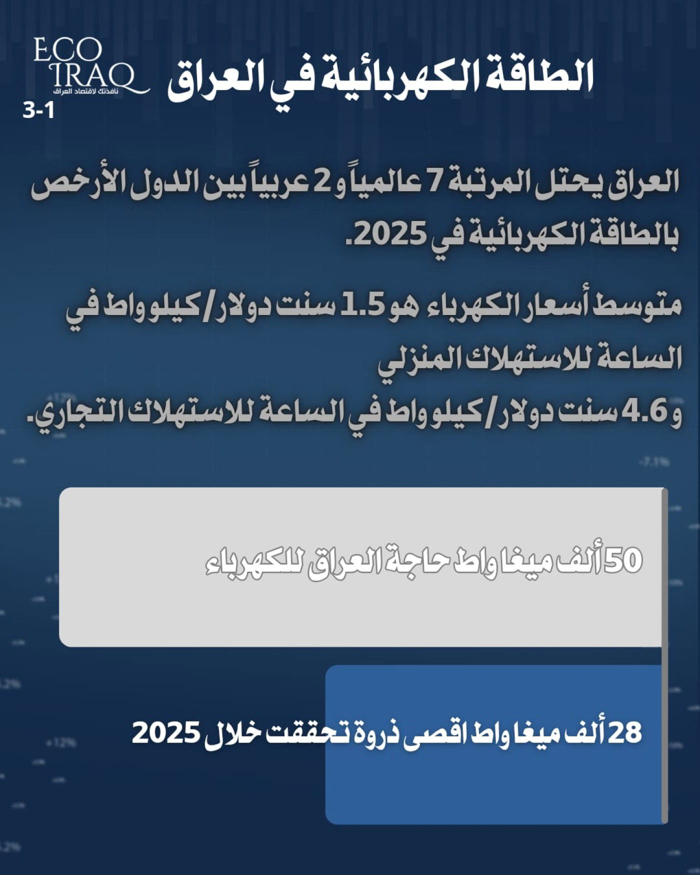 مرصد "إيكو العراق" ذكر في بيان صحفي، السبت 13 كانون الأول 2025، أن "العراق يعد من الدول الرخيصة في أسعار بيع الكهرباء، إذ تتراوح التعرفة بين 1.5 سنت و4.6 سنتات للدولار/كيلو واط في الساعة، ما يضعه في المرتبة السابعة عالمياً والثانية عربياً من حيث انخفاض الأسعار".