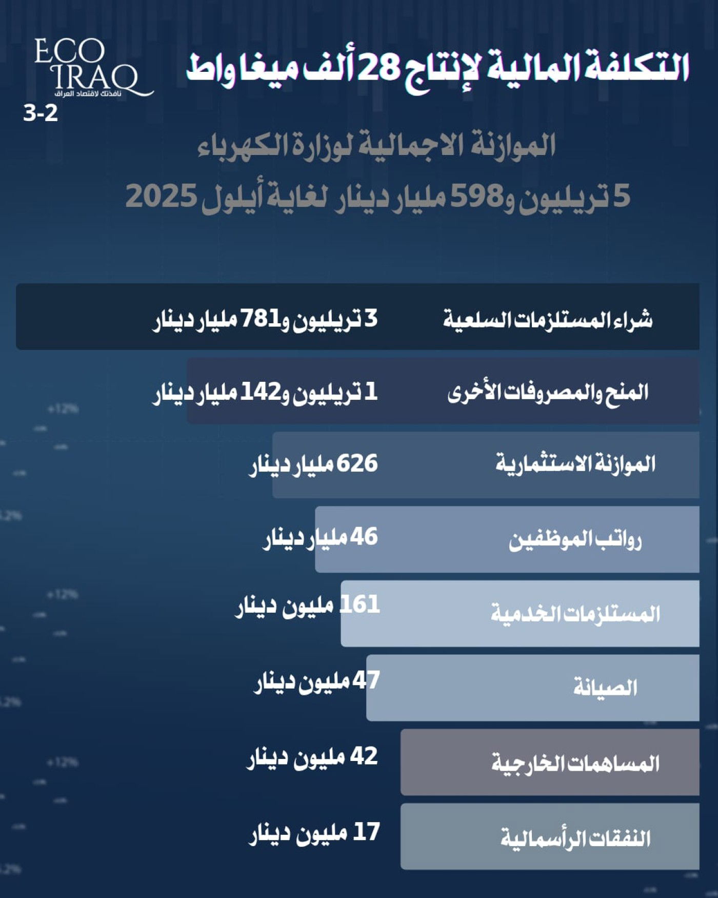 وأوضح البيان أن "تكلفة إنتاج الكهرباء لغاية شهر أيلول 2025، بلغ 5 تريليونات و6 مليار دينار"، مشيراً إلى أن "ذروة الإنتاج الحالية بلغت 28 ألف ميغاواط، في حين أن تلبية الطلب بشكل كامل تتطلب نحو 50 ألف ميغاواط".